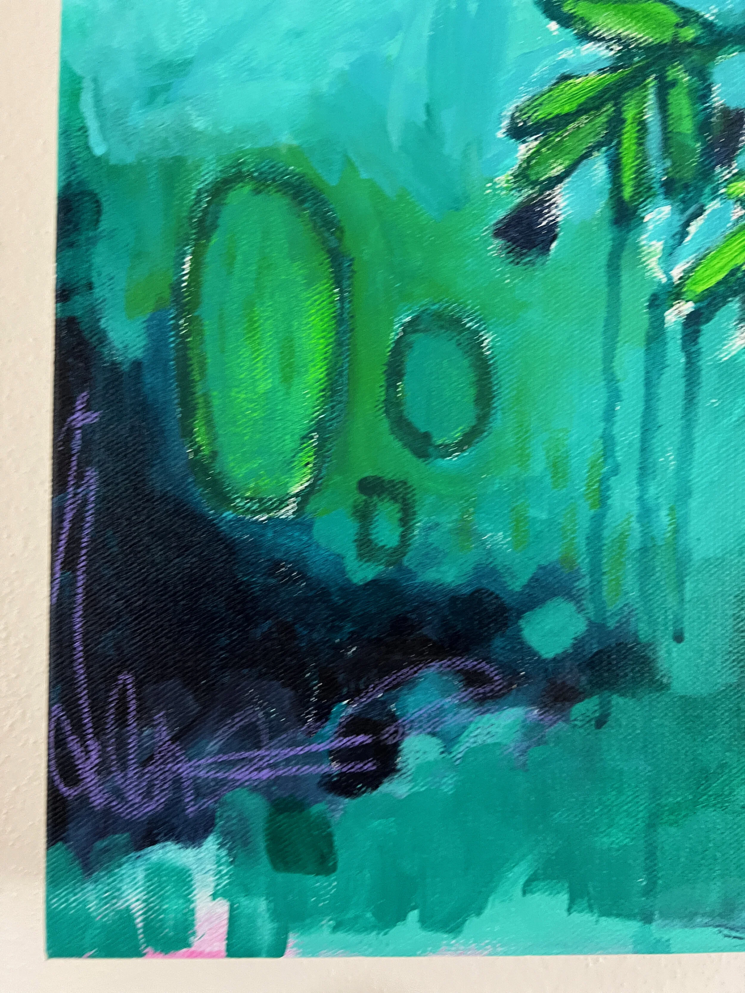 Scenes crafted with palettes of deep thick velvety purples and grayblues, the lush blues, aquas and greens, lime green leaves. Mixed medias create the many low contrasting layers of foliage on top of each other. Each composition and size is different, transporting the viewer through the lush landscape demonstrating the emotional wonder and mystery of the space.